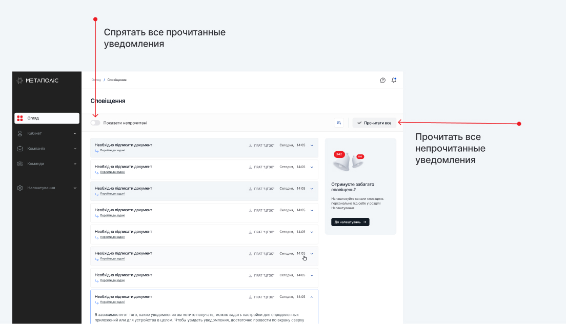Если ты работаешь на нескольких предприятиях, все сообщения со всех твоих учётных записей, подключённых в Метаполисе, отображаются в одном месте — в разделе Оповещения или Центре оповещений. Нет необходимости отдельно входить в каждую учётную запись.