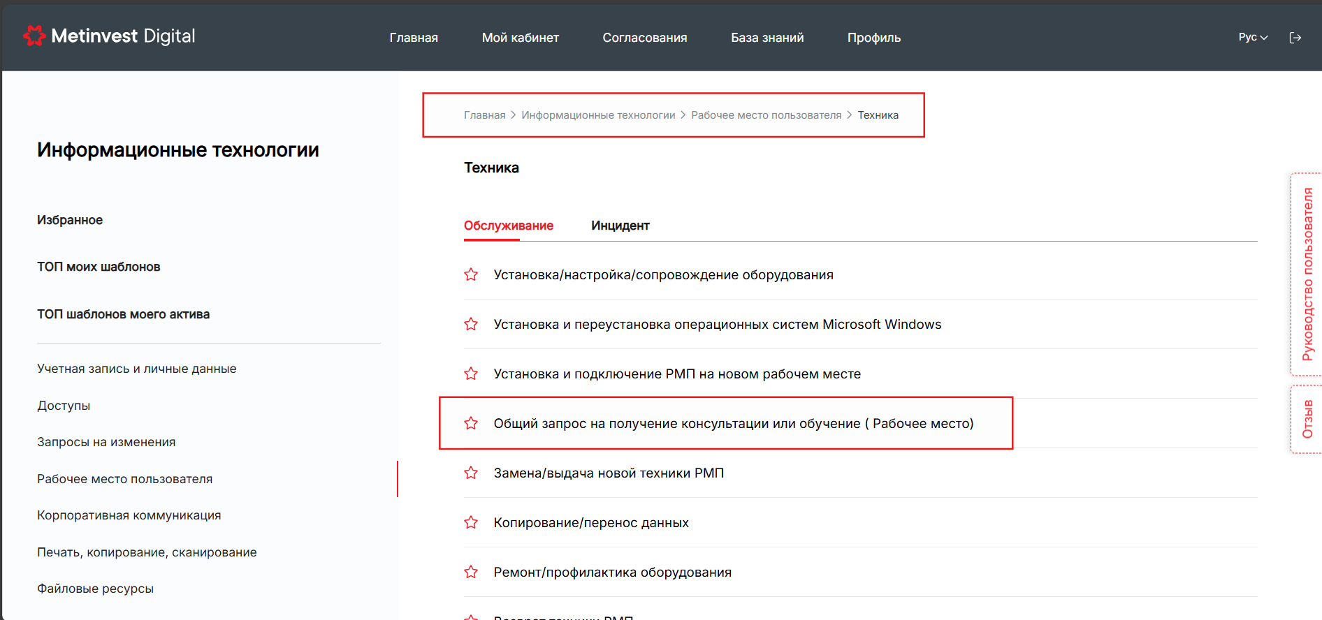 На главной странице выбрать: Информационные технологии → IT-запросы → Рабочее место пользователя → Техника → Общий запрос на получение консультации или обучения (Рабочее место)