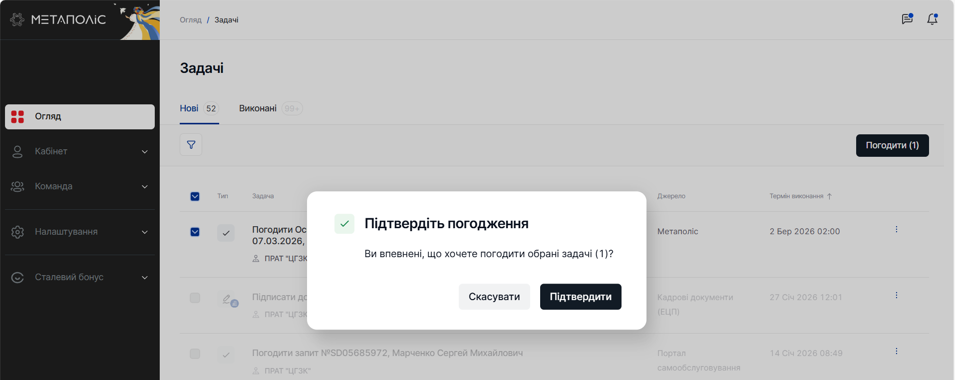 Шаг 2. После выбора всех нужных тебе задач нажми на кнопку Согласовать, которая активируется вверху списка задач. У названия будет отображено количество задач, которые ты выбрал