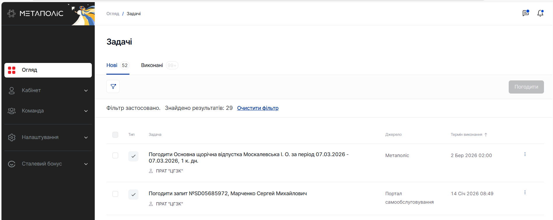 Если ты работаешь на нескольких предприятиях, все задачи со всех твоих учётных записей, подключённых в Метаполисе, отображаются в одном месте — в разделе Задачи. Нет необходимости отдельно входить в каждую учётную запись, все действия можно выполнять в одном разделе, при этом доступность действий не меняется.