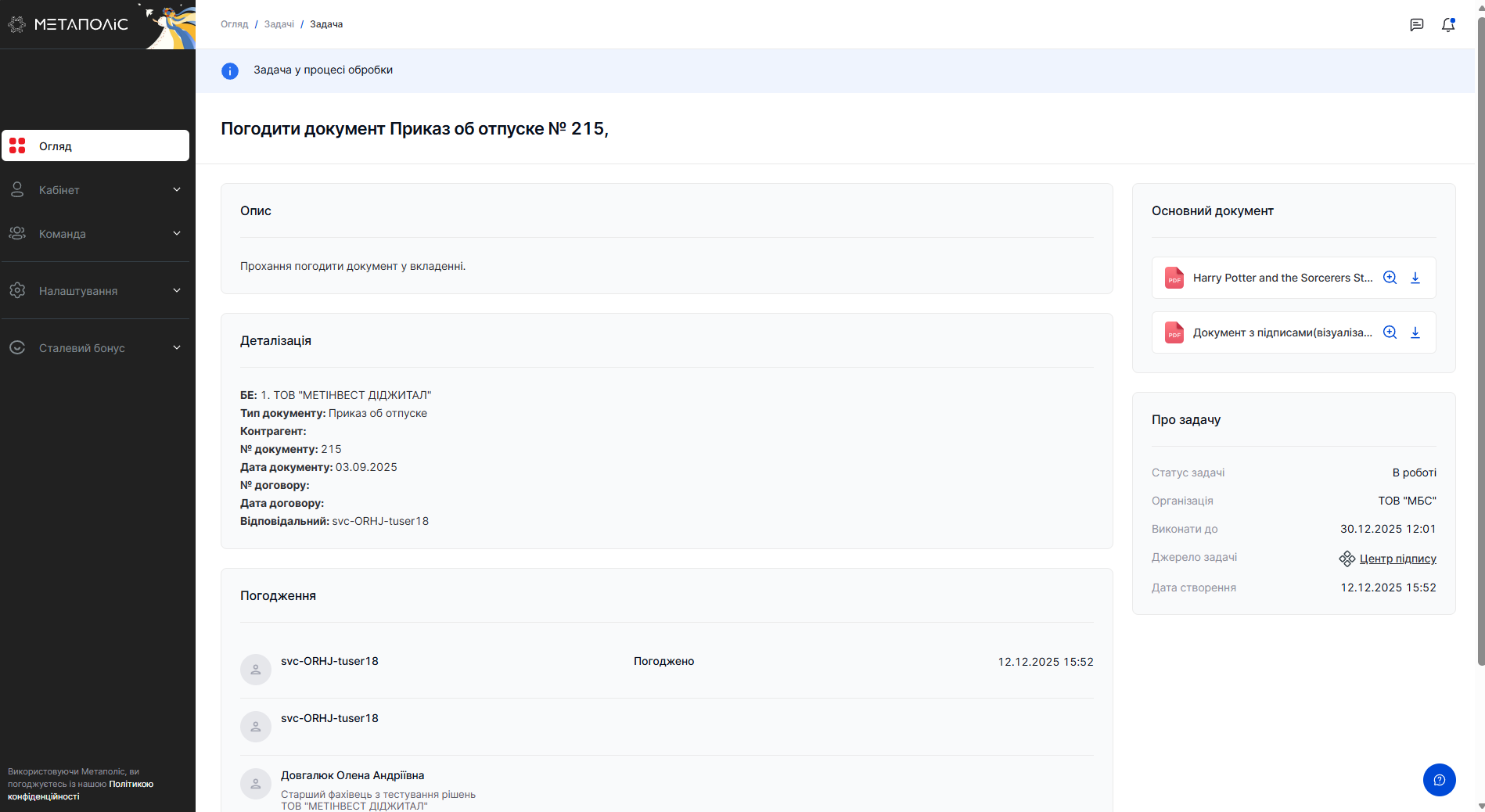 Задачи на согласование отпуска в Метаполис