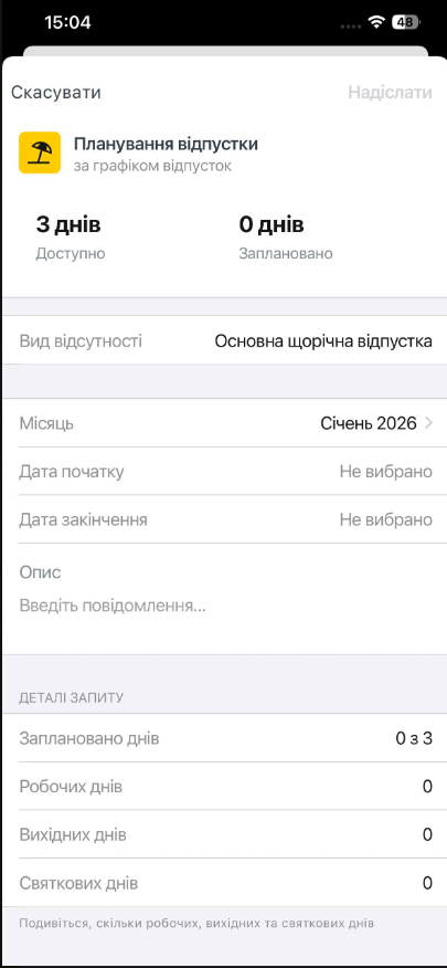 Шаг 3. Выбери дату начала отпуска. Проверь, что система сама рассчитает дату окончания согласно количеству дней, запланированных на выбранный месяц.