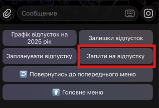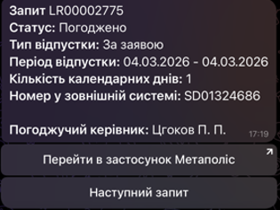 В результаті в чат-боті відобразиться перший запит зі списку актуальних Запитів на відпустку в Метаполіс, створених тобою. Для того, щоб відобразити наступний запит у списку, натисни кнопку Наступний запит.