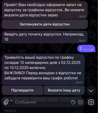 За 14 днів до місяця, в якому ти планував відпустку, Метаполіс надішле тобі повідомлення в чат-бот про необхідність обрати дати та оформити відпустку. Для оформлення виконай наступні кроки: