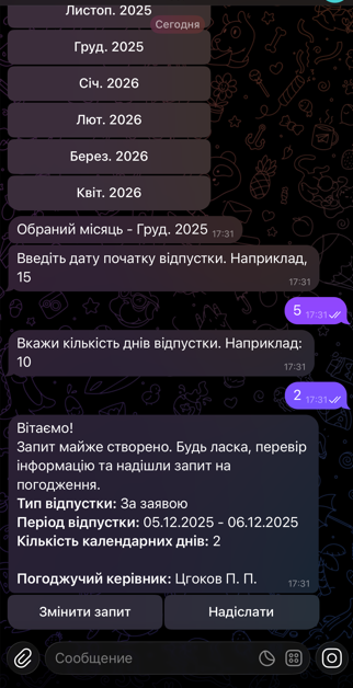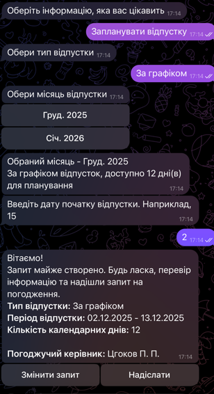 Для того щоб запланувати відпустку за заявою із Чат-бот Метаполіс, зайди у відповідне меню: