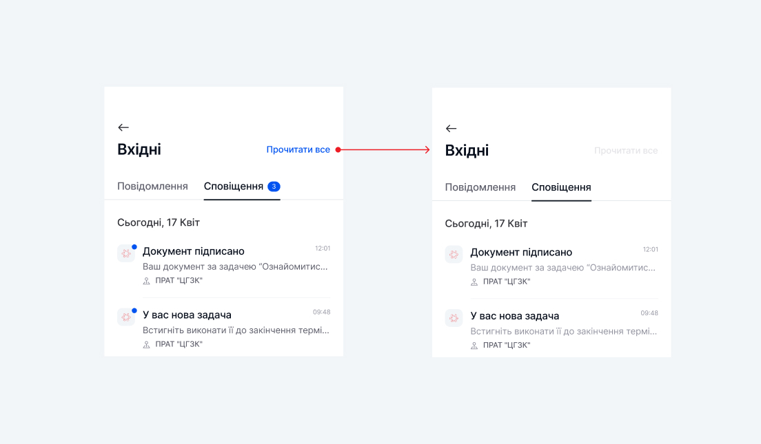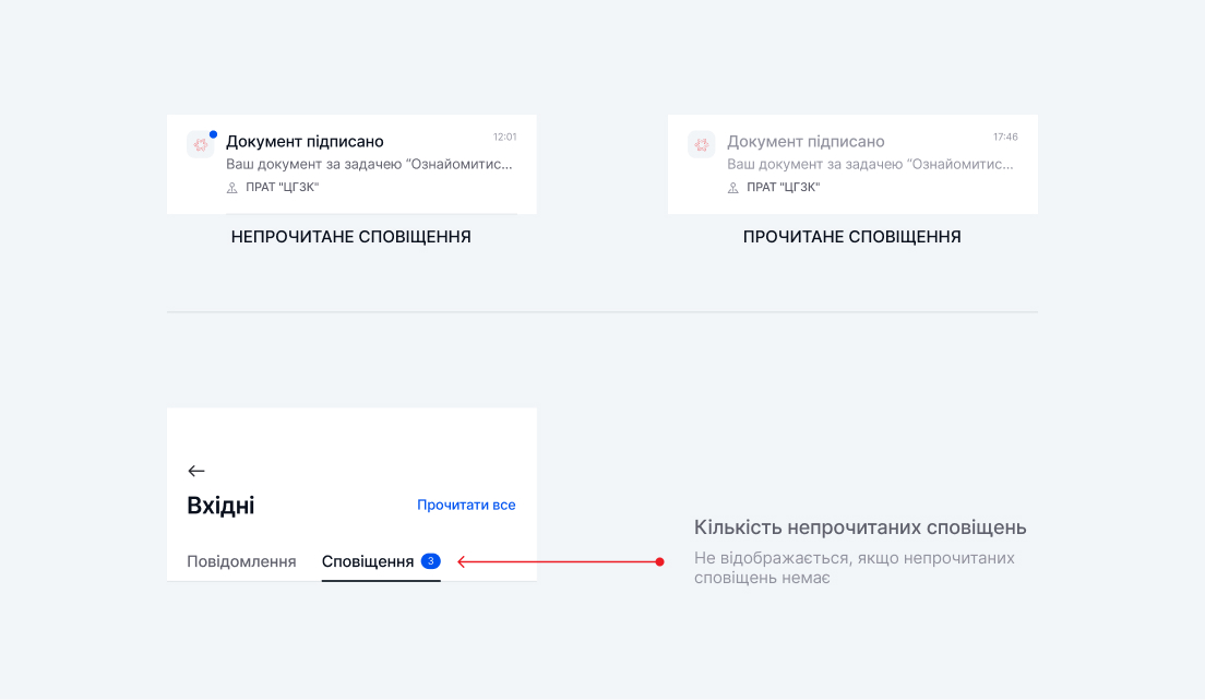 Непрочитані сповіщення будуть мати додатковий блакитний індикатор, що розміщуються праворуч від іконки джерела сповіщення, та зникає, як тільки сповіщення буде прочитане.