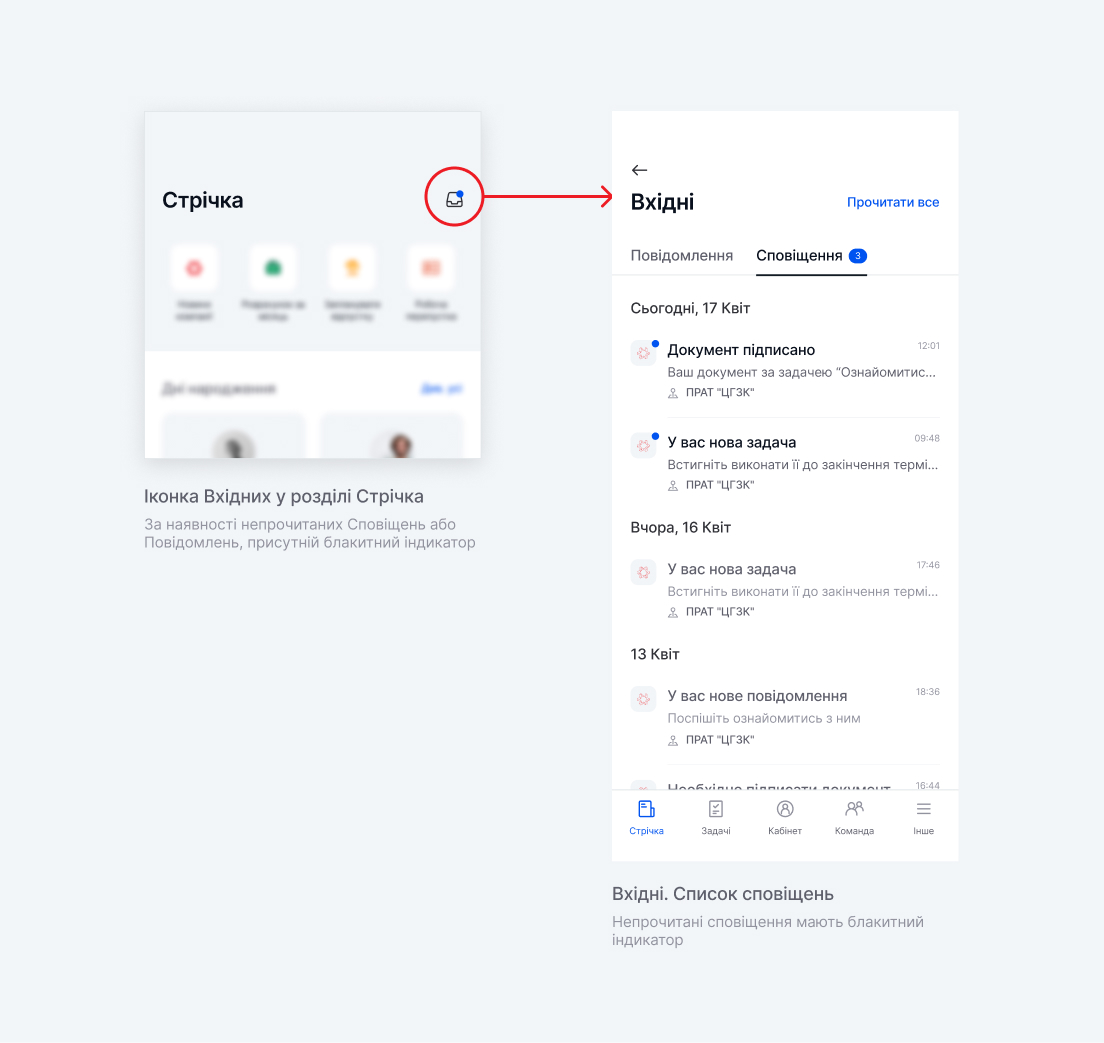 В мобільному застосунку Сповіщення розміщені у розділі Вхідні разом із Повідомленнями. Щоб перейти до Вхідних натисни відповідну іконку в розділі Стрічка, що знаходиться у правому верхньому кутку. За наявності нових непрочитаних Сповіщень або повідомлень, іконка матиме додатковий блакитний індикатор.