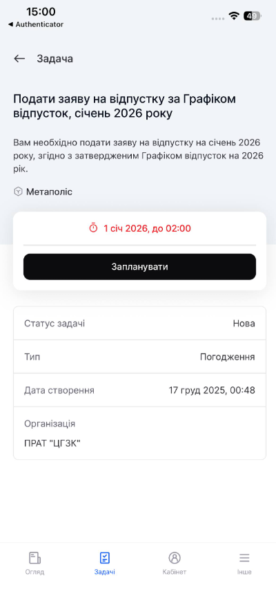 ЗВЕРНИ УВАГУ! Якщо ти сумісник, для виконання задачі на планування відпустки потрібно авторизуватися під тим обліковим записом, на який надійшла задача, оскільки такі задачі не агрегуються