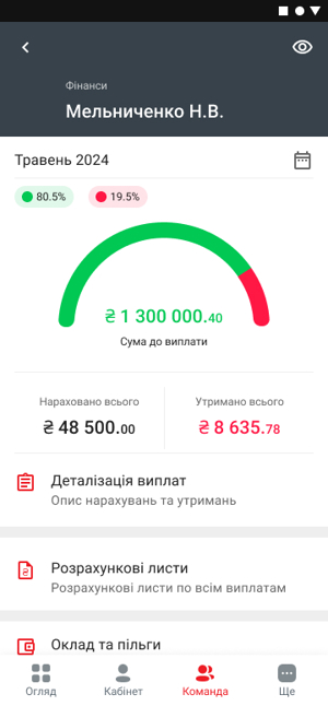 В списку підлеглих ти побачиш інформацію про загальну суму нарахувань, утримань та суму виплат за обраний місяць.