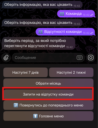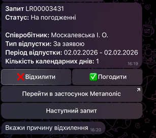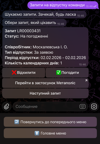 В результаті в чат-боті відобразиться перший запит зі списку актуальних Запитів на відпустку в Метаполіс, створених твоїми підлеглими.